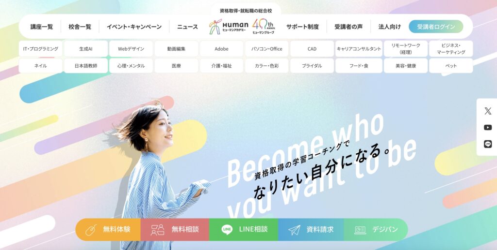 資格取得だけでなく、その後のキャリアまでしっかり考えたい方にはヒューマンアカデミーがおすすめです。特に「スキルを活かして仕事にしたい」「就職までサポートしてほしい」という方にとっては非常に心強い存在です。分野も幅広いため、自分に合ったキャリアを見つけたい方にも適しています。長期的な視点でキャリアを築きたい方に向いているスクールです。