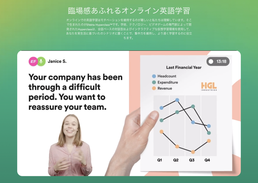 EF English Liveは、世界中に展開する大手語学教育ブランドEFが提供するオンライン英会話サービスです。マンツーマンレッスンに加え、グループレッスンも受講できる点が特徴で、実際のビジネスシーンに近い環境で英語を学ぶことができます。また、体系的なカリキュラムにより、初心者から上級者まで段階的にスキルアップが可能です。海外の雰囲気を感じながら学習したい方に適しています。