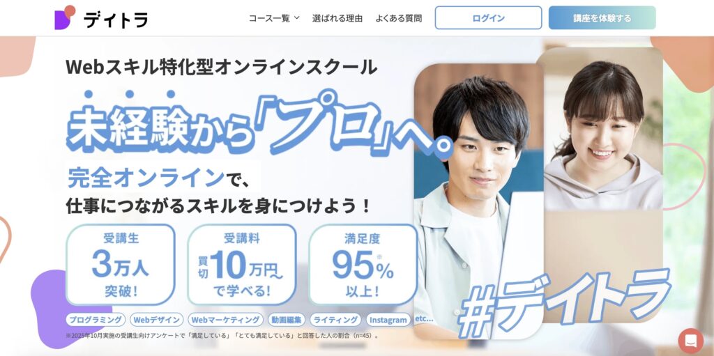 デイトラは、実務に直結するスキルを短期間で習得できるオンラインスクールです。コストパフォーマンスの高さが魅力で、「できるだけ費用を抑えて学びたい」という方に支持されています。